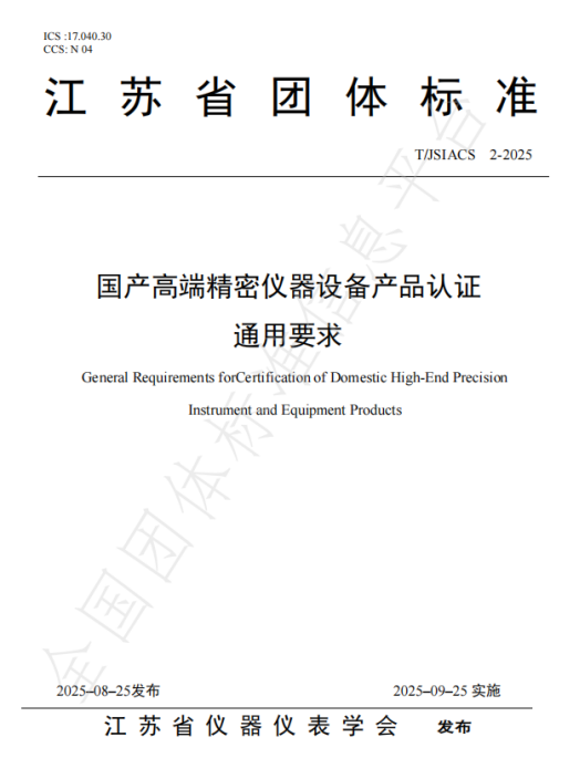 近日,江蘇省儀器儀表學會正式批準發(fā)布團體標準《國產(chǎn)高端精密儀器設備產(chǎn)品認證通用要求》(標準編號:T/JSIACS 2 - 2025)。該標準嚴格依據(jù)《江蘇省儀器儀表學會標準管理辦法(試行)》制定,圍繞國產(chǎn)高端精密儀器設備產(chǎn)品認證,在基本要求、國產(chǎn)化要求、品質(zhì)屬性等關鍵維度作出明確規(guī)范,適用于國產(chǎn)高端精密儀器設備產(chǎn)品的通用認證場景。