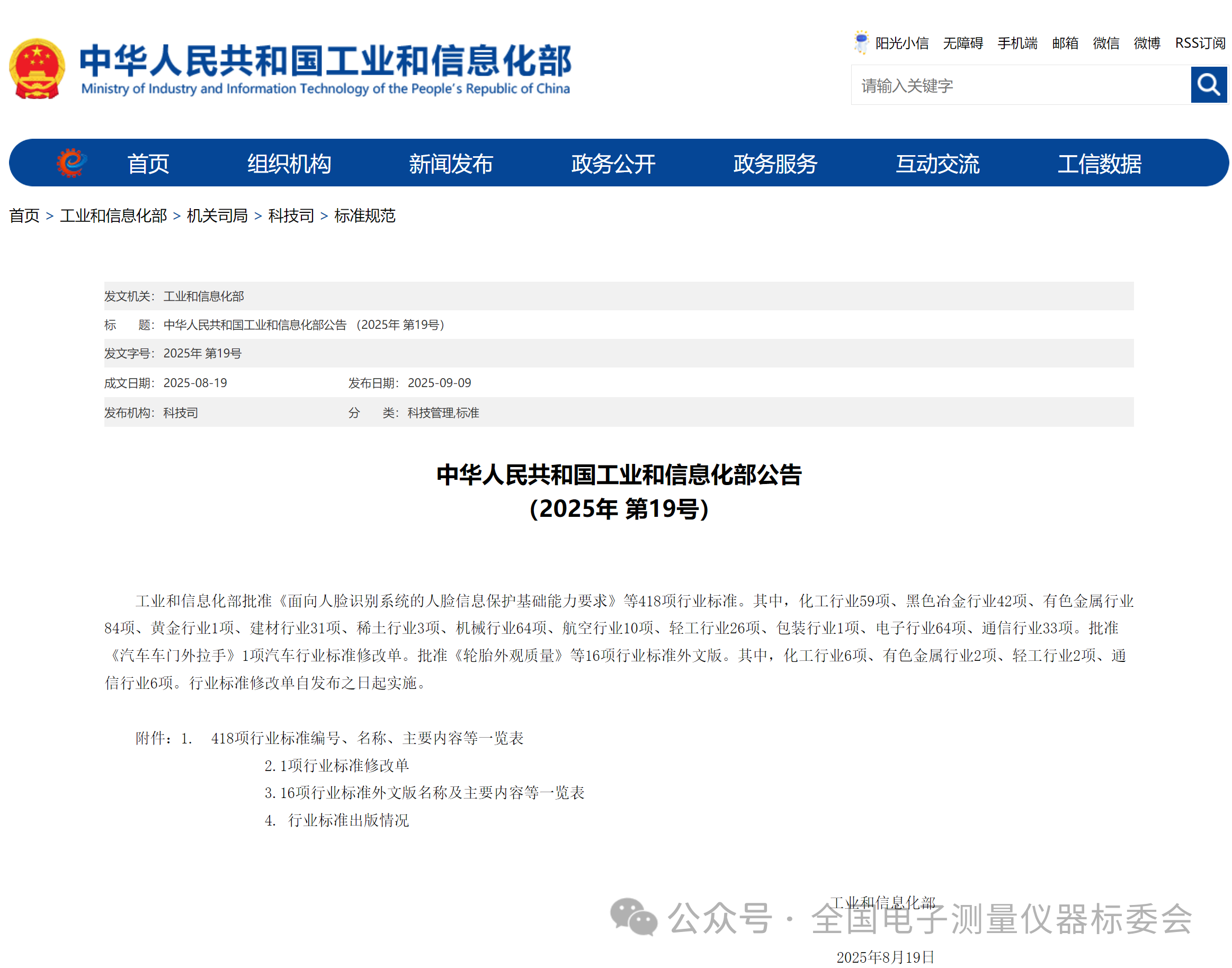 根據(jù)中華人民共和國工業(yè)和信息化部公告(2025年 第19號),由全國電子測量儀器標準化技術委員會歸口的《鋰電池芯短路測試儀》(標準號:SJ/T 10230-2025)《電子紅外額溫計通用規(guī)范》(標準號:SJ/T 10231-2025)等2項電子行業(yè)標準正式發(fā)布。